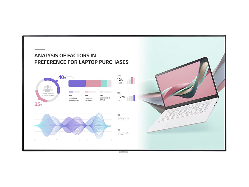 Благодаря рекомендуемой яркости 500 кд/м² для использования в помещениях дисплеи серии UH5J-M четко передают контент и привлекают внимание общественности, что делает эти устройства оптимальными для реализации маркетинговых целей в конференц-залах, аэропортах, магазинах розничной торговли, торговых центрах и т. д.