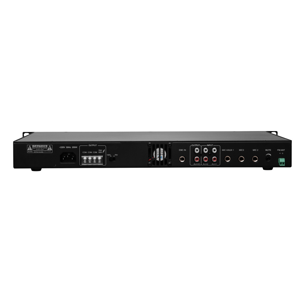 Оборудован плеером с ЖК дисплеем и поддержкой Udisk, TF card, Bluetooth. / 3 микрофонных и 2 линеных входа с независимыми регулировками громкости. / Приоритет: EMC>MIC1>MIC2-4, AUX1-2. / Защита от перегрева, короткого замыкания и высокой нагрузки.