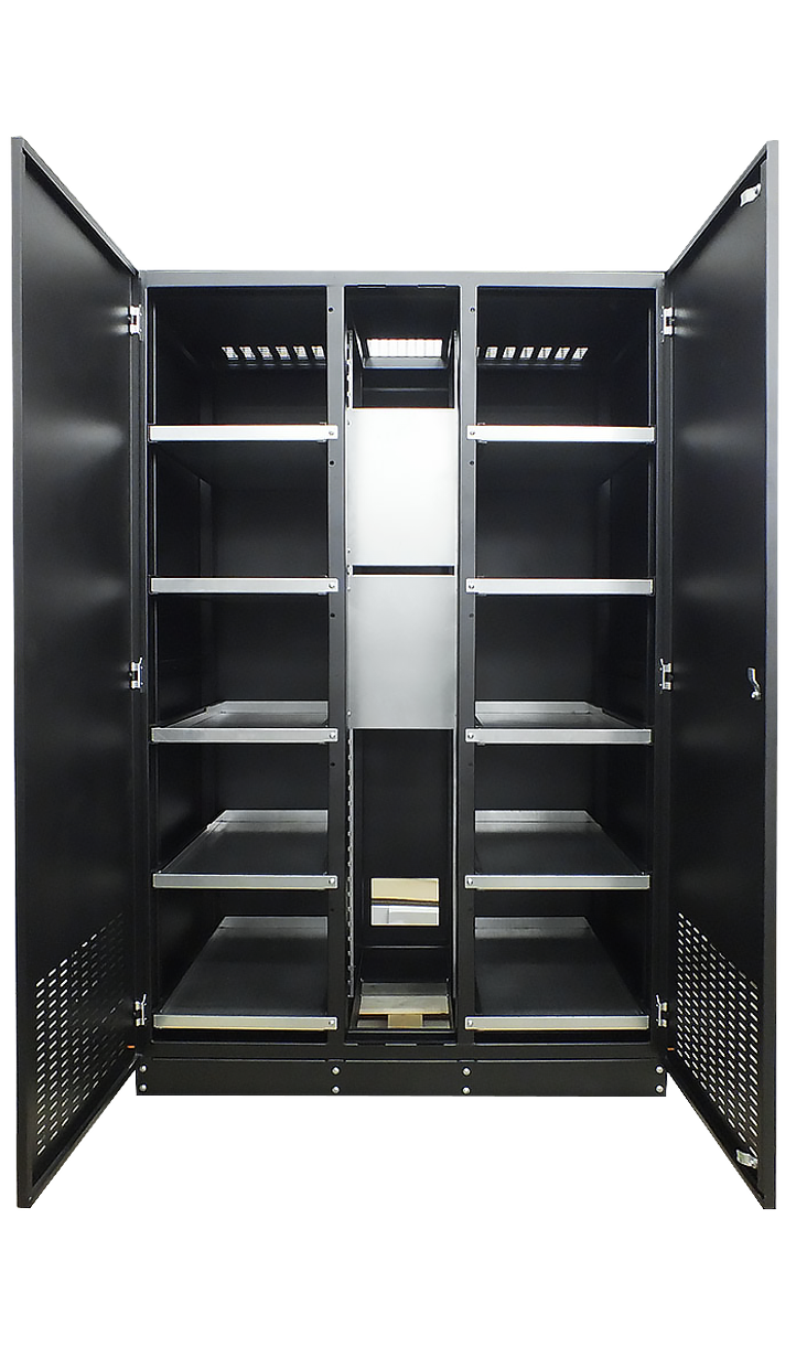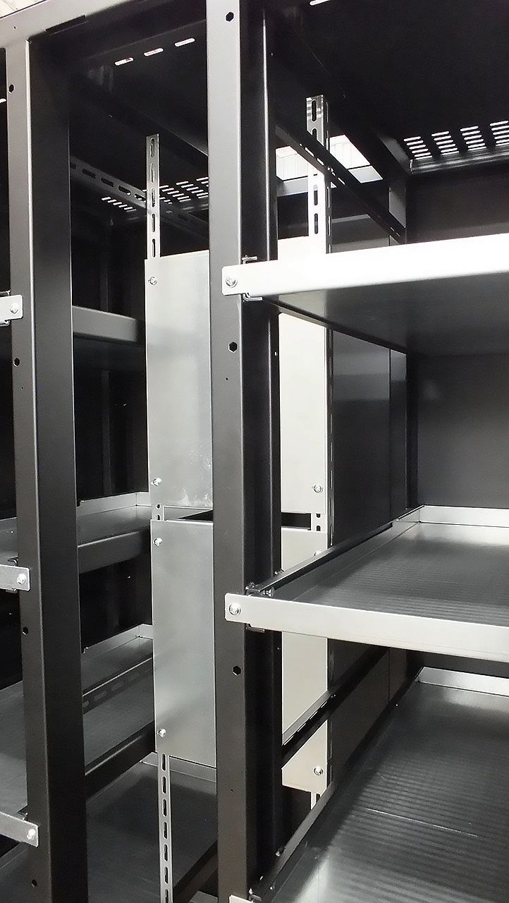 Боковые стенки снабжены двумя одноточечными замками. Доступ к оборудованию осуществляется с четырех сторон, через переднюю или заднюю двери, а также легкосъемные боковые стенки.